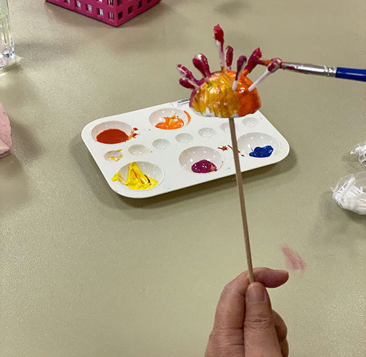 Members helping elderly patients to paint flowers
