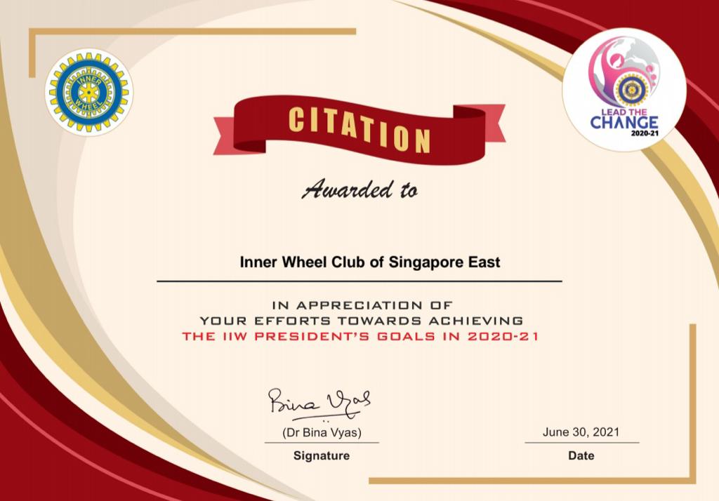 Inner Wheel Club of Singapore East receives citation in achieving the IIW President's Goals in 2020=2021