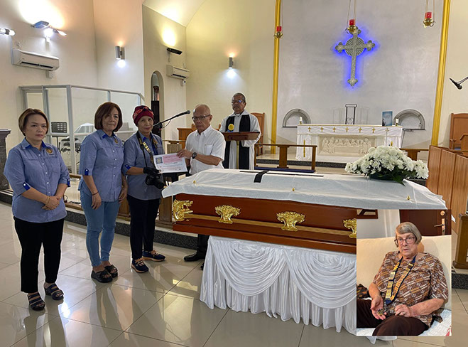 Cecilia (third left) accompanied by (from left) Rosena, Busak handing over the first batch of donation RM6,530,00 from members in IWD330, 331 and 332 to Norman (the nephew of Florence - photo inserted at right) after the funeral service conducted by Fr. Augustine Saidi (5th left)